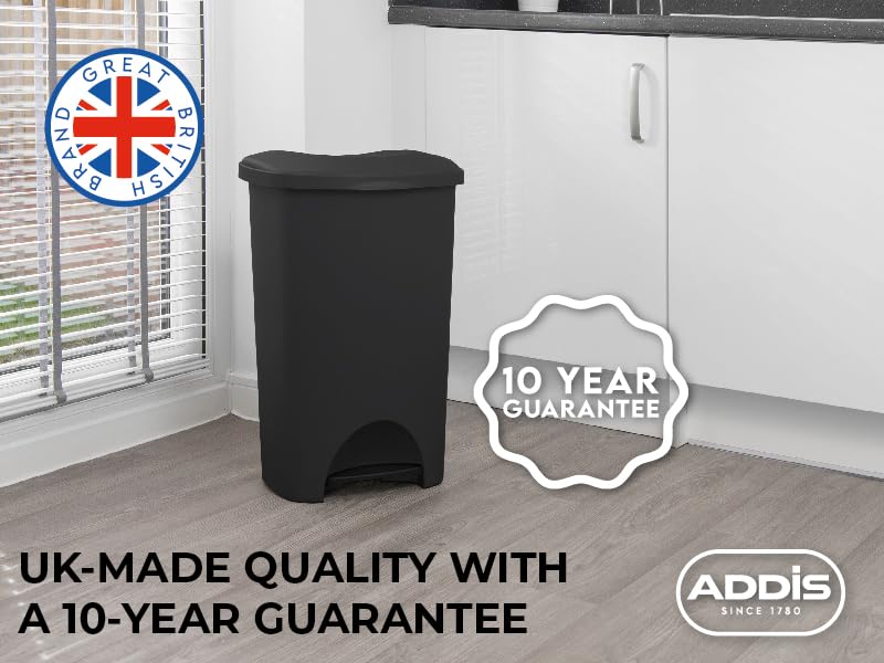 - Flat back space saving bin design to perfectly fit against kitchen walls; Hygienic pedal opening operation for convenient no handed daily use or manual full lid opening for changing the bin liners and emptying; Perfect for use with Addis 50 litre bin liner bags