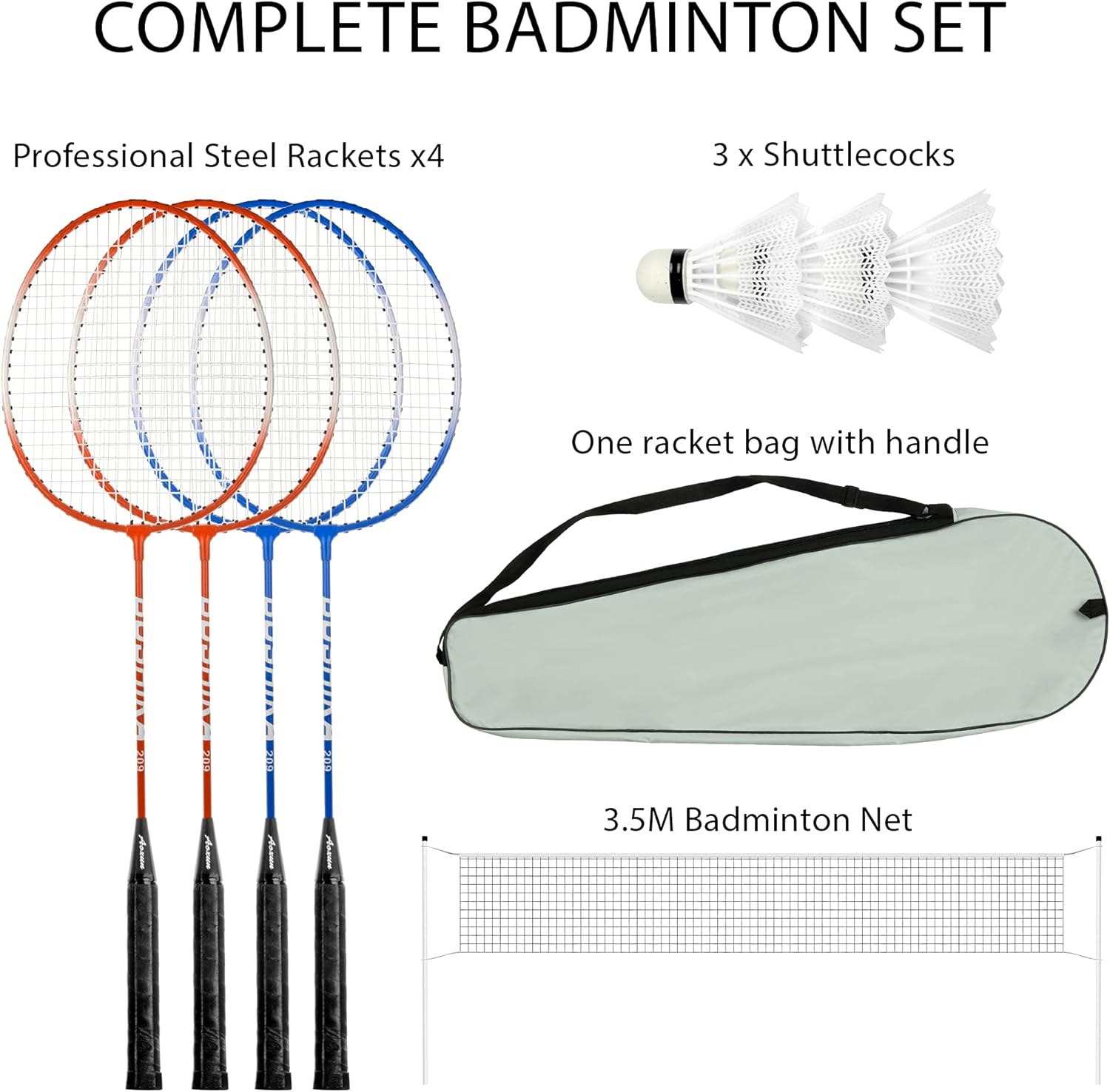 • ALL IN ONE SET – The badminton set contains 4 x light badminton rackets, 3 x shuttlecocks, 6 x height-adjustable net holders, 1 x reinforcement rope, 1 x badminton net, 4 x ground reinforcement stud and 1 x portable carry bag.